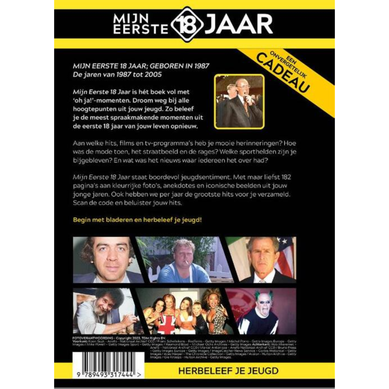 MIJN EERSTE 18 JAAR; GEBOREN IN 1987 De jaren van 1987 tot 2005 Mijn Eerste 18 Jaar is hét boek vol met ‘oh ja!’-momenten. Droom weg bij alle hoogtepunten uit jouw jeugd. Zo beleef je de meest spraakmakende momenten uit de eerste 18 jaar van jouw leven opnieuw. Aan welke hits, films en tv-programma’s heb je mooie herinneringen? Hoe was de mode toen, het straatbeeld en de rages? Welke sporthelden zijn je bijgebleven? En wat was het nieuws waar iedereen het over had? Mijn Eerste 18 Jaar staat boordevol jeugdsentiment. Met maar liefst 182 pagina’s aan kleurrijke foto’s, anekdotes en iconische beelden uit jouw jonge jaren. Ook hebben we per jaar de grootste hits voor je verzameld. Scan de code en beluister jouw hits. Begin met bladeren en herbeleef je jeugd!