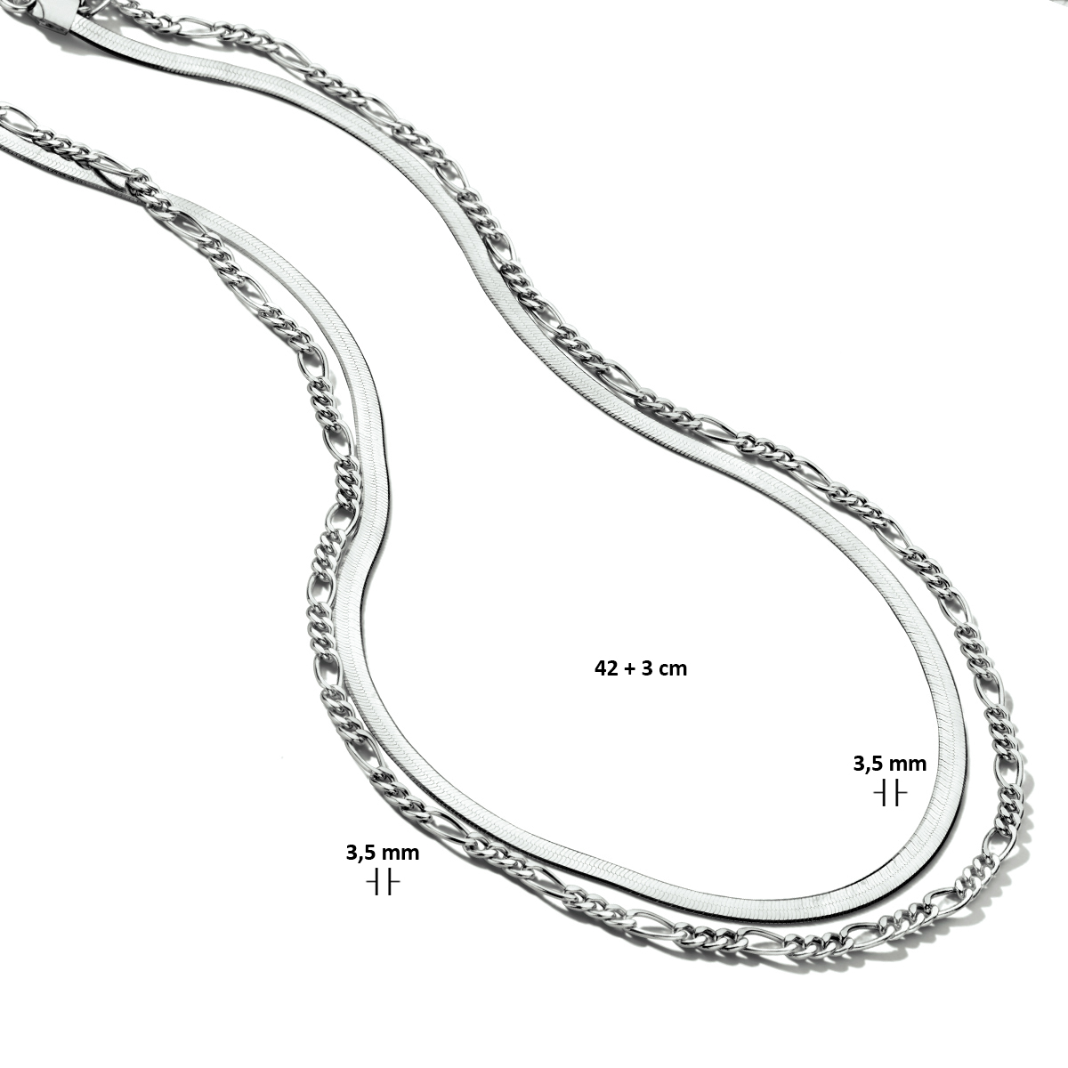 Gerhodineerd 925 zilveren collier uitgevoerd met een figaro en omega schakel van 3.5mm. Het collier heeft een draaglengte van 42cm met een extensie van 3cm en een karabijn sluiting.