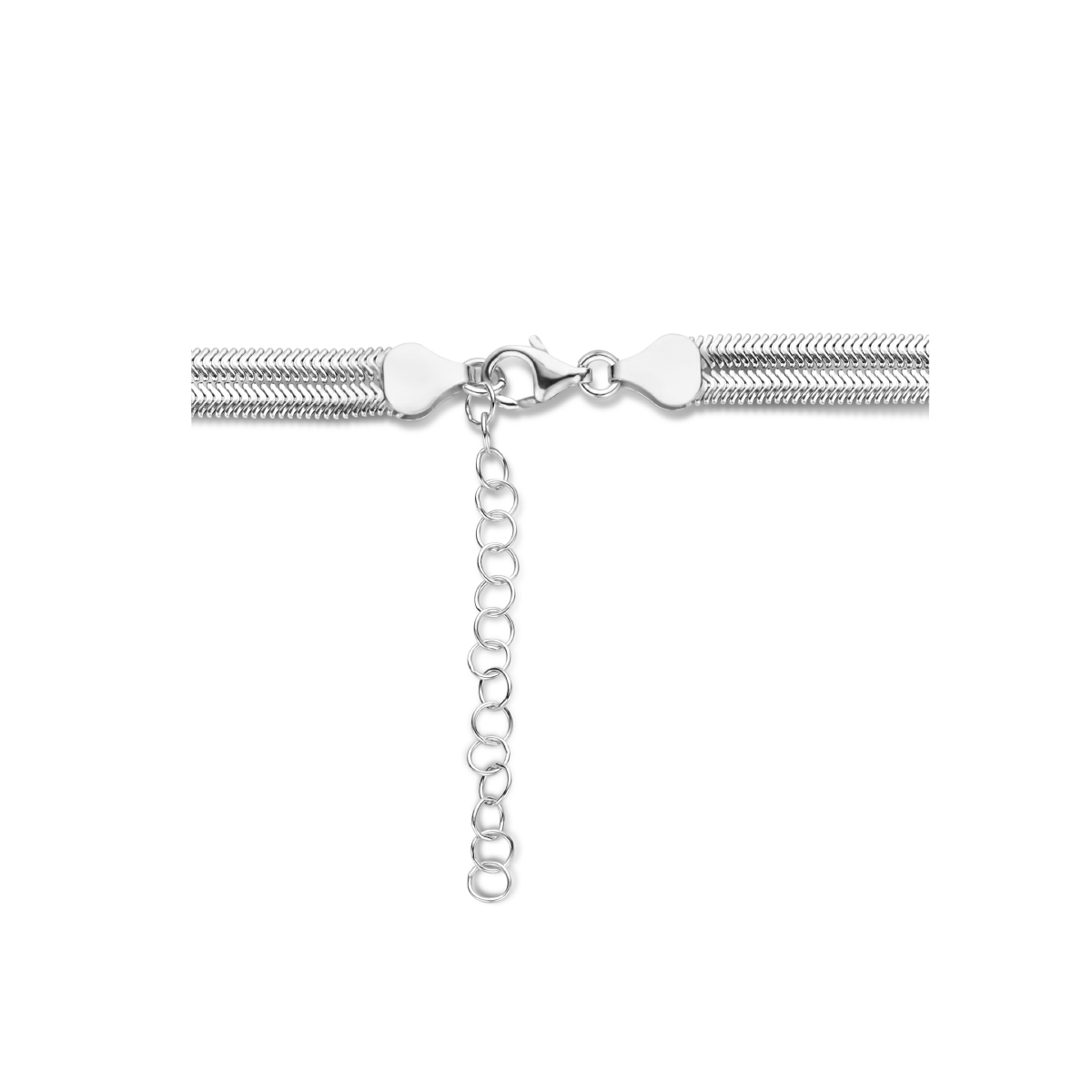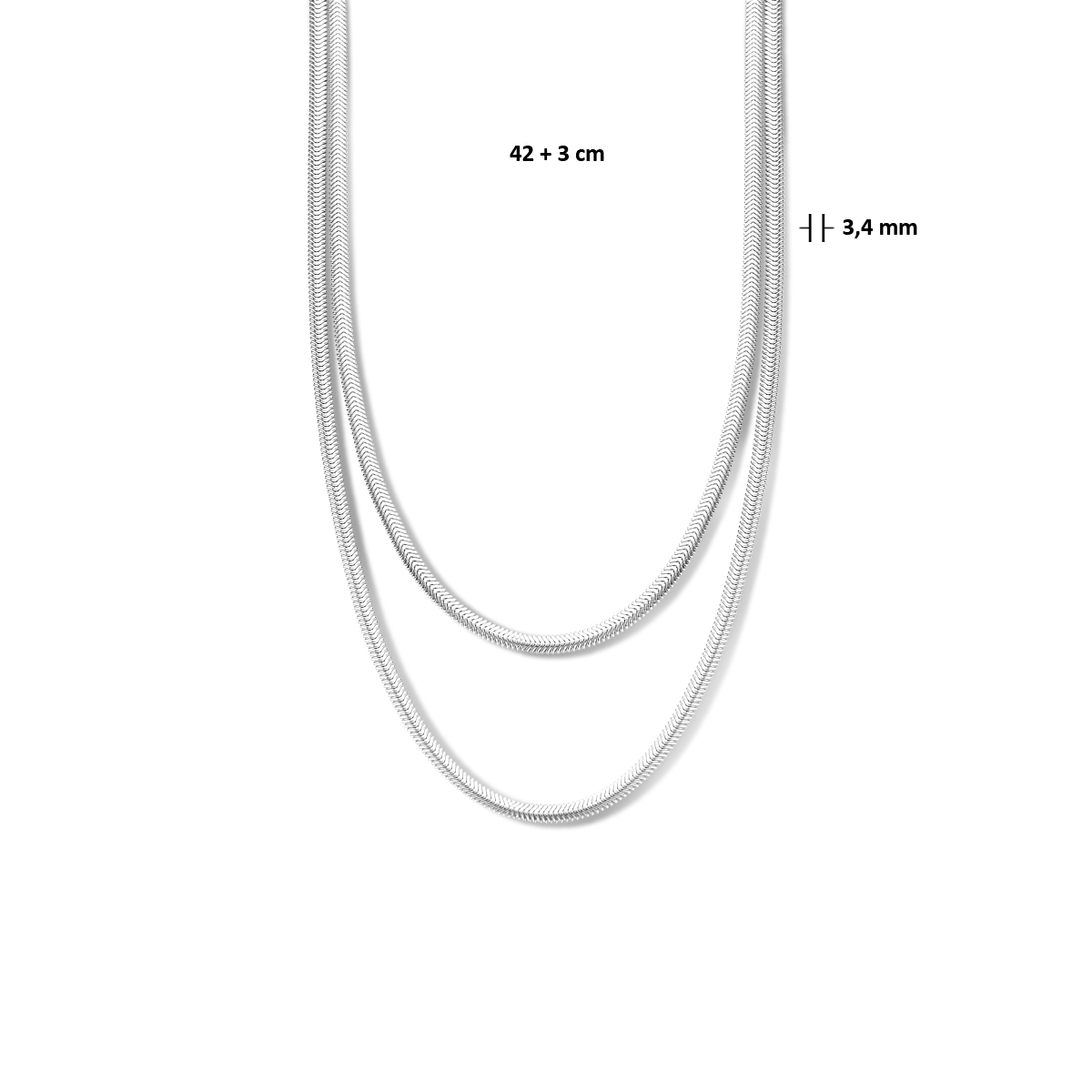 Gerhodineerd 925 zilveren omega collier met een schakelbreedte van 3.4mm en een karabij sluiting. Het collier heeft een draaglengte van 42cm en een extensie van 3cm.