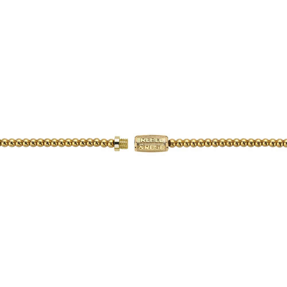 Bead ketting, handgemaakt van 3 mm 18-karaats goud ion-plated edelstalen stenen met een 18-karaats goud ion-plated edelstalen schroefsluiting. Het Rebel & Rose sieraad is makkelijk te combineren met zilveren, leren of kralenarmbanden.