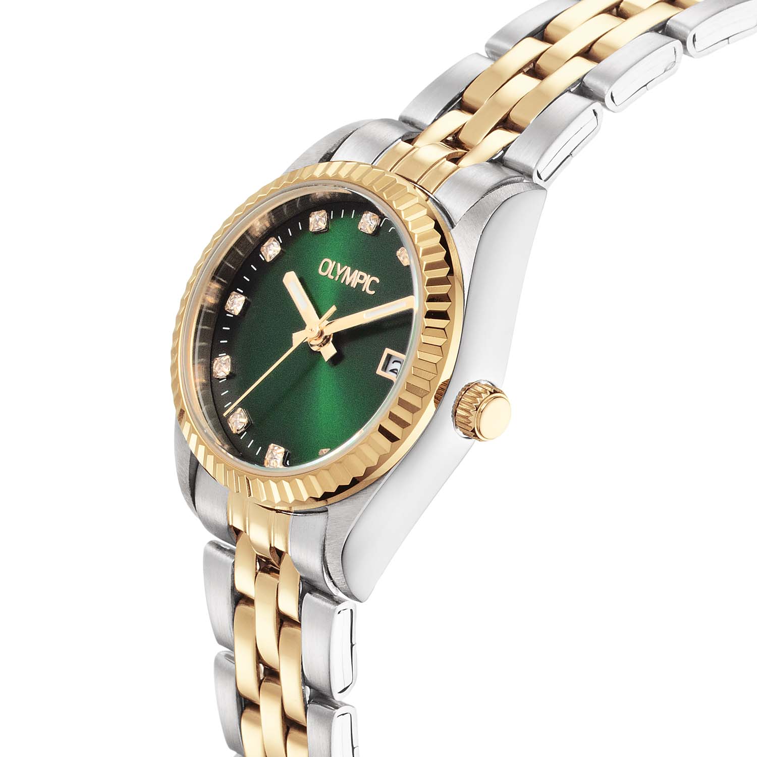 Dit unieke Olympic horloge met artikelnummer: OL75DSD002B is een dameshorloge met een chique sportieve uitstraling. Het horloge heeft een ronde stalen kast met een geribbelde goudkleurige bezel, een groene wijzerplaat en een datum en zirkonia als uursaanduiding. Aan de kast zit een fijne stalen bicolor schakelband met druksluiting. Het horloge heeft een mineraalglas, een schroefdeksel, een doorsnee van 26mm en is 5ATM.