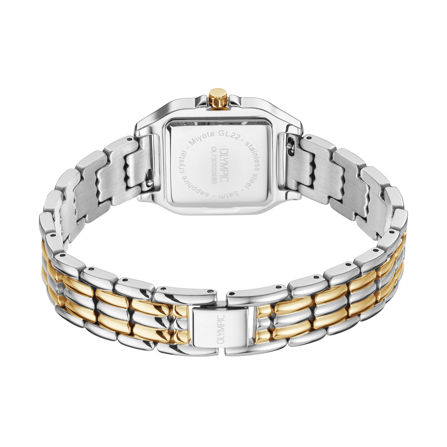Dit unieke Olympic model met artikelnummer: OL73DSS008B is een chique dameshorloge. Het horloge heeft een stalen vierkante kast met een goudkleurige bezel en een zilverwitte wijzerplaat met strepen en romeinse cijfers. Aan de kast zit een bicolor stalen schakelband met een druksluiting. Het horloge heeft een saffierglas, een doorsnee van 26mm en is 5ATM.