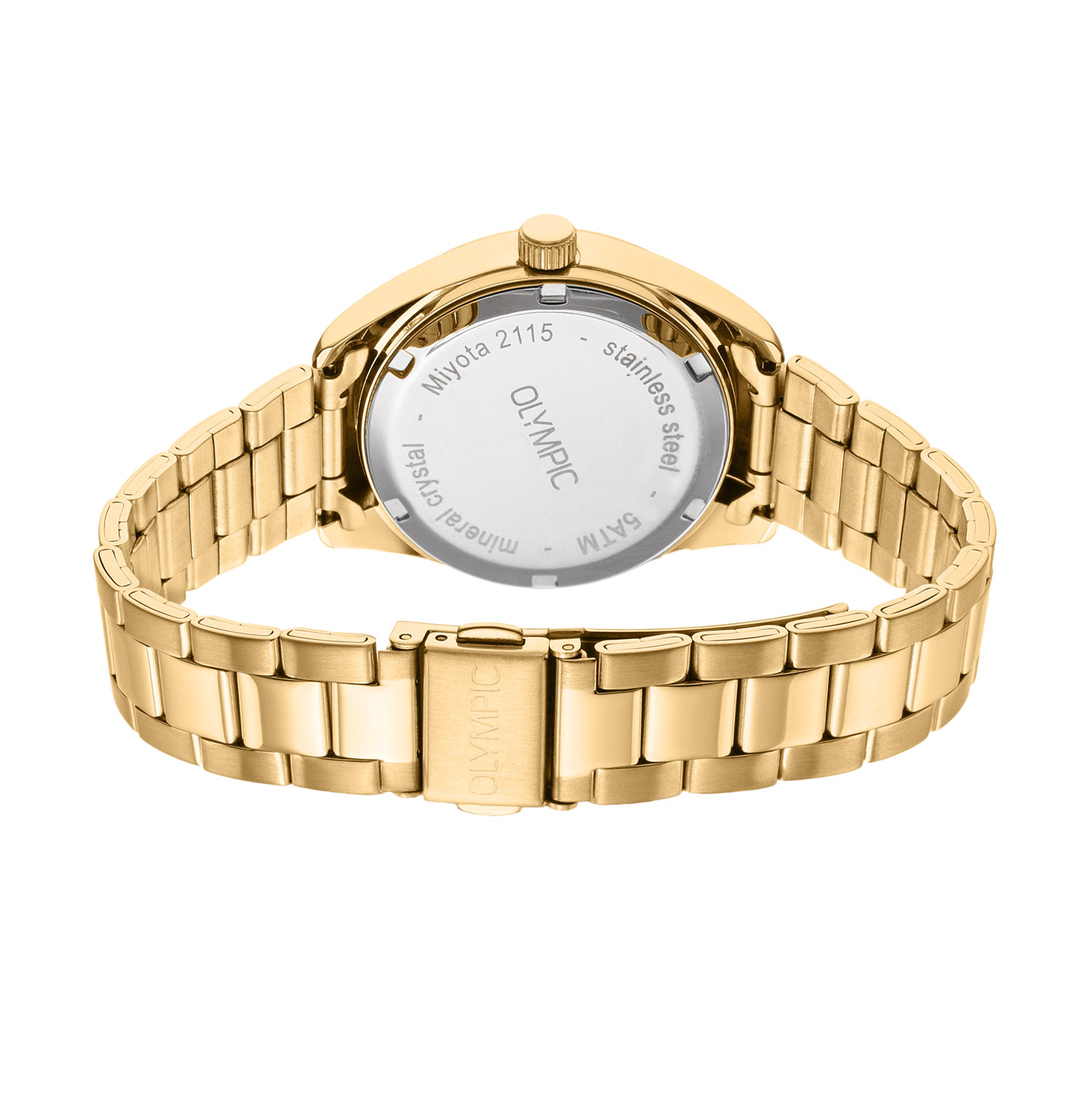 Dit unieke Olympic horloge met artikelnummer: OL75DDD002 is een classic dameshorloge. Het horloge heeft een stalen goudkleurige kast met een glanzende goudkleurige bezel, een zwarte wijzerplaat met streepjes als uursaanduiding en een datum. Aan de kast zit een goudkleurige stalen schakelband met een vouwsluiting. Het horloge heeft een mineraalglas, een doorsnee van 33mm en is 5ATM.