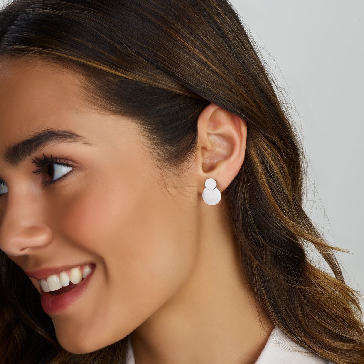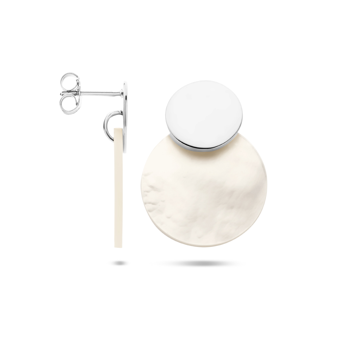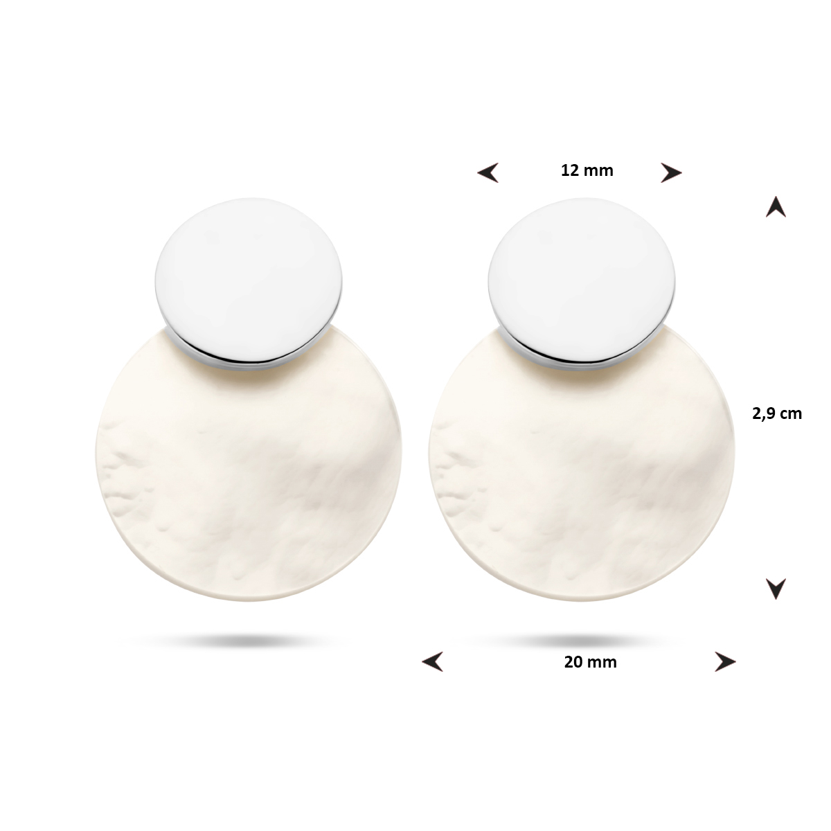 Gerhodineerd 925 zilveren ronde oorhangers uitgevoerd met parelmoer. De oorhangers hebben een totale hoogte van 2.9cm.