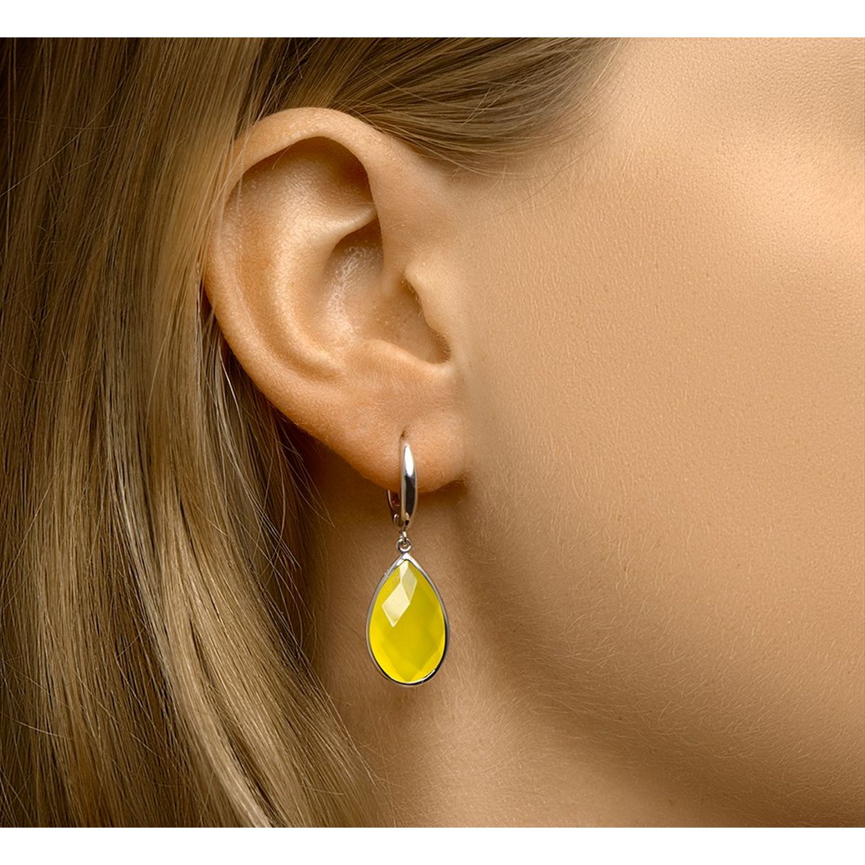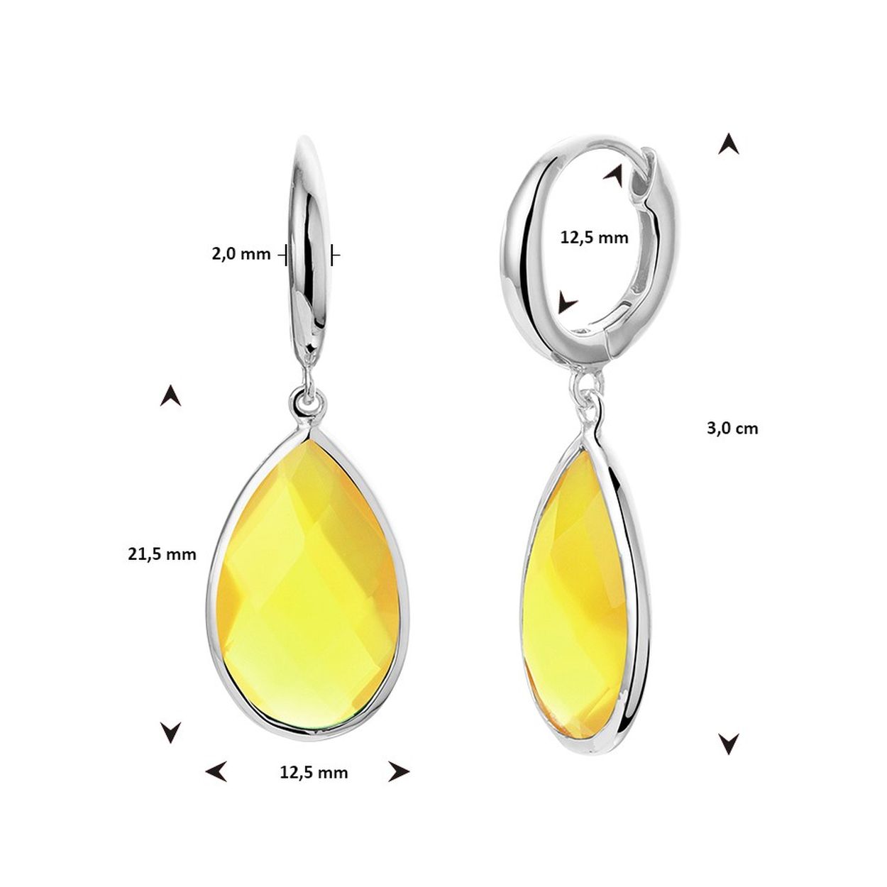 Gerhodineerd 925 zilveren oorringen uitgevoerd met een hanger in druppelvorm met daarin een schitterende geel chalcedoon. De oorringen hebben een totale hoogte van 3cm en een breedte van 12.5mm.