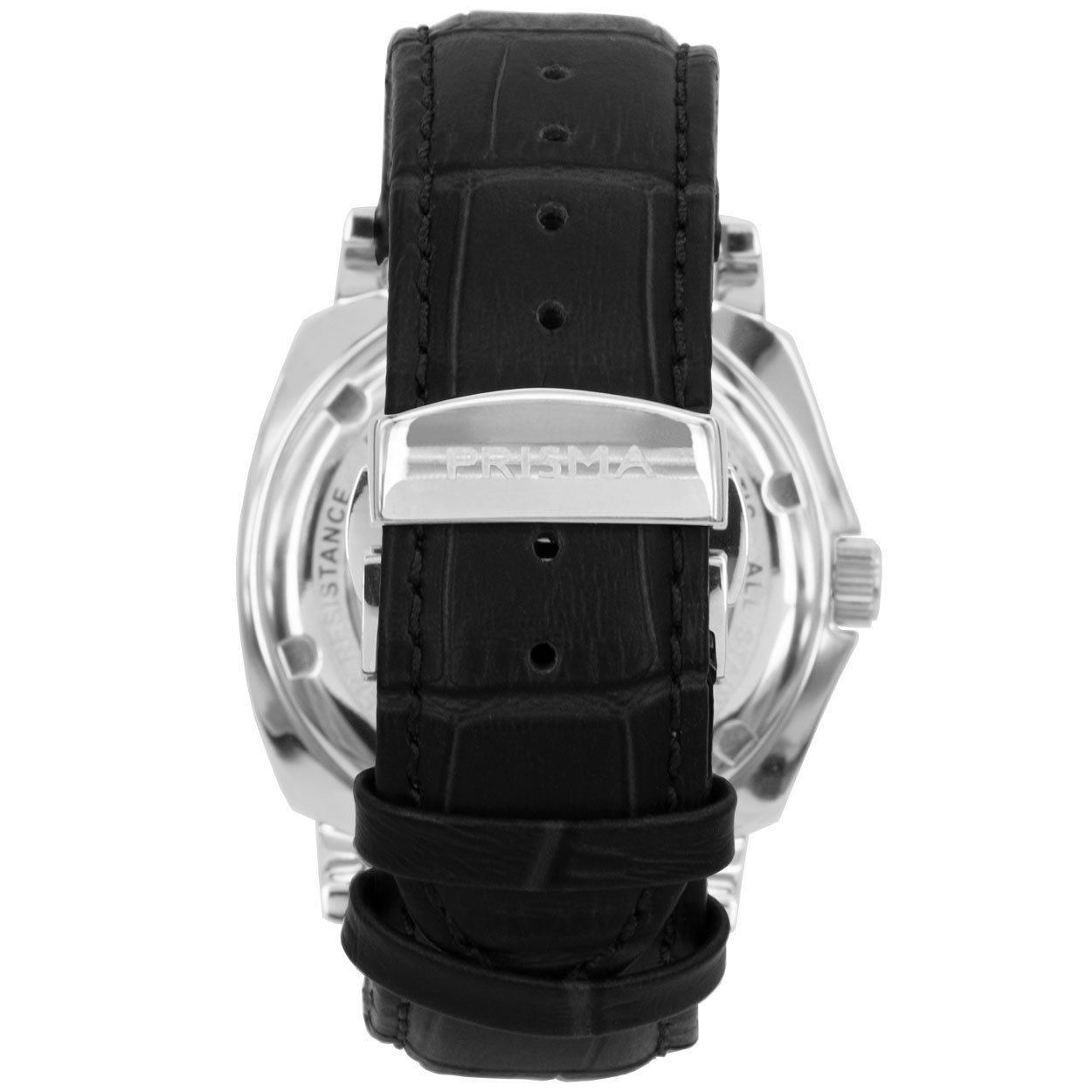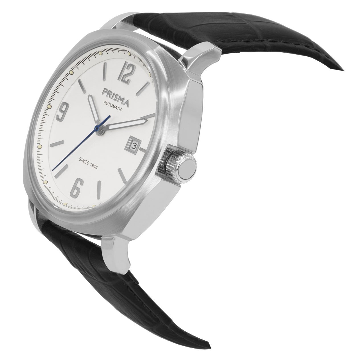 De Prisma Horloge Heren Automaat P1315 heeft een saffierglas, een zilverkleurige vierkante kast van roestvrij staal en een zwarte leren band met krokodilprint. Het horloge heeft een analoge wijzerplaat met streepjesindex, een datumfunctie, is antiallergisch en waterbestendig tot 10 ATM. Perfect te dragen bij zowel formele als casual outfits.