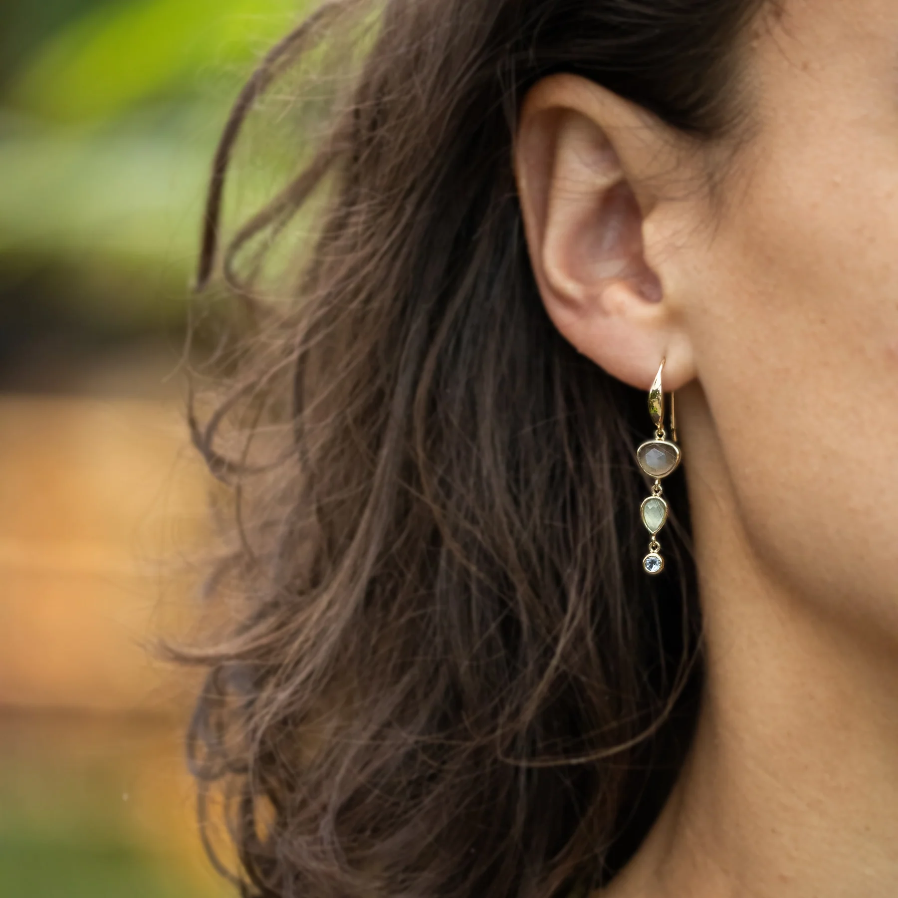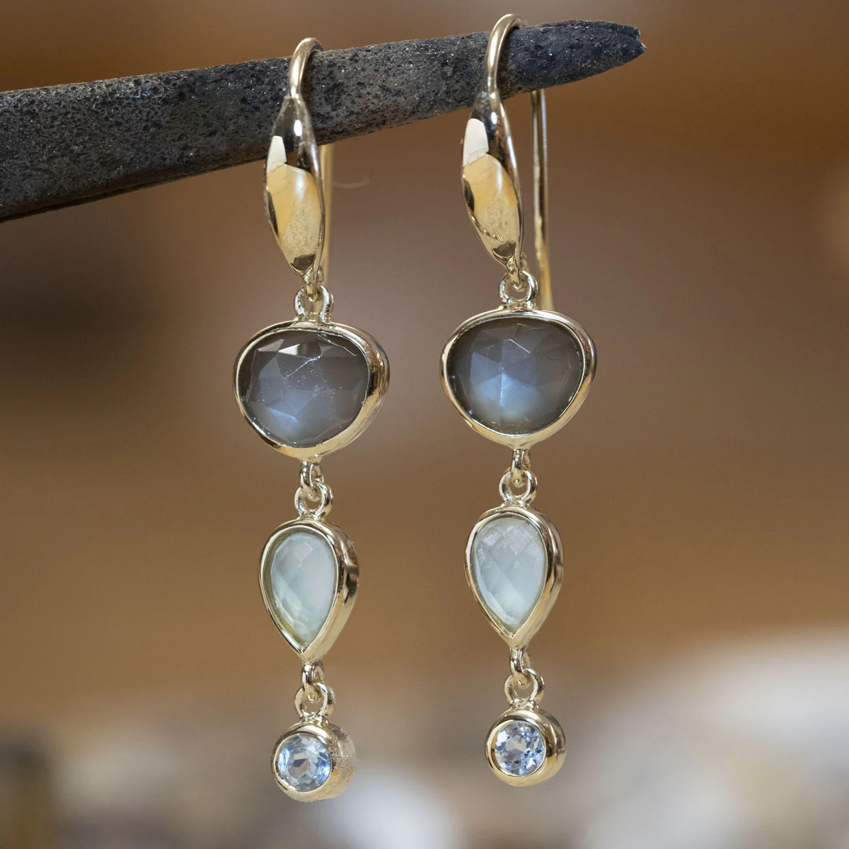 Deze vergulde oorbellen zijn beide versierd met een 7 x 6 mm roosgeslepen grijze maansteen, een 6 x 4 mm chalcedoon en een 2,5 mm gefacetteerde blauwe topaas. De lengte van de oorbellen is +/- 2,5 mm.