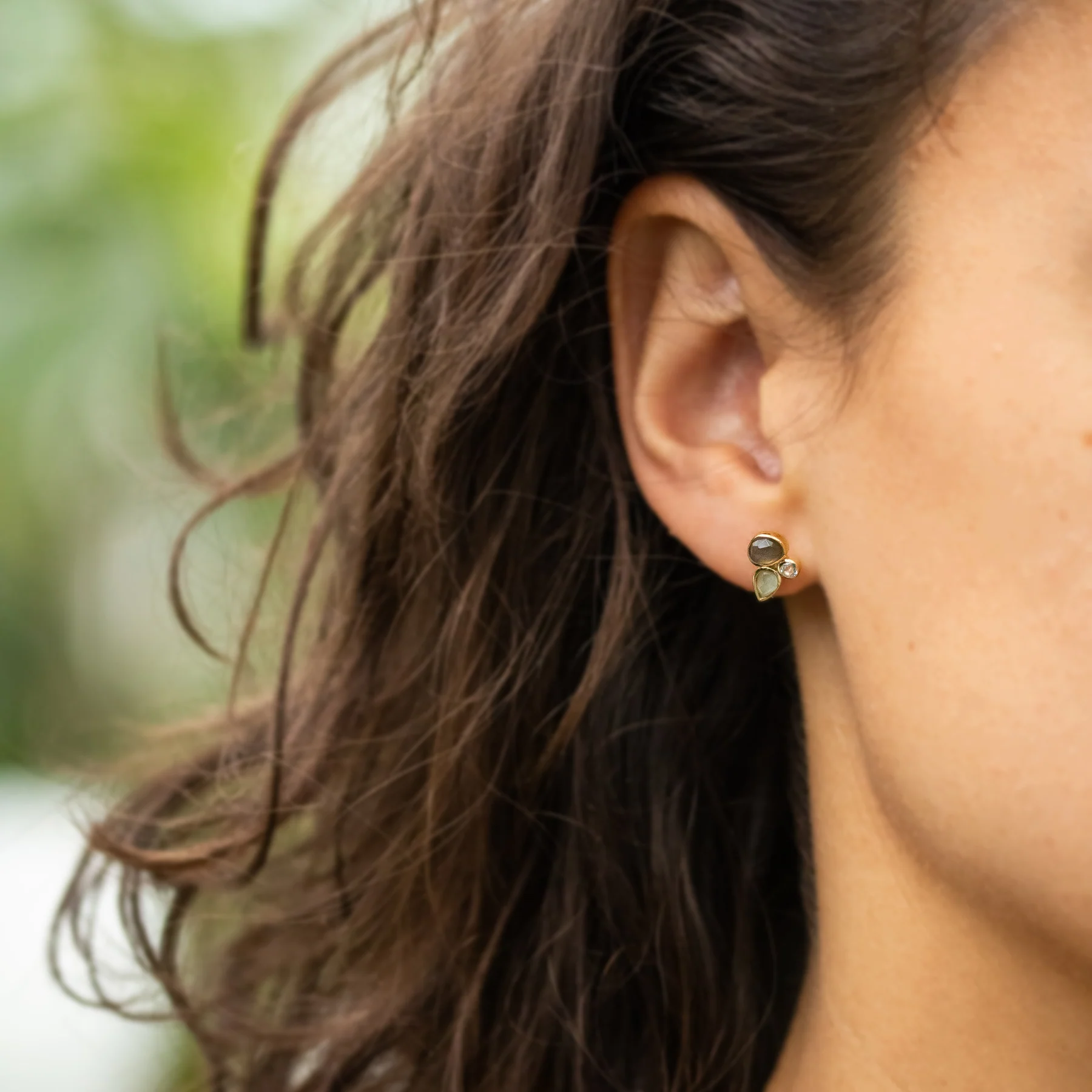 Deze vergulde oorknoppen hebben elk een 5 x 4 mm roosgeslepen grijze maansteen, een 5 x 3 mm chalcedoon en een 2,5 mm ronde gefacetteerde blauwe topaas.