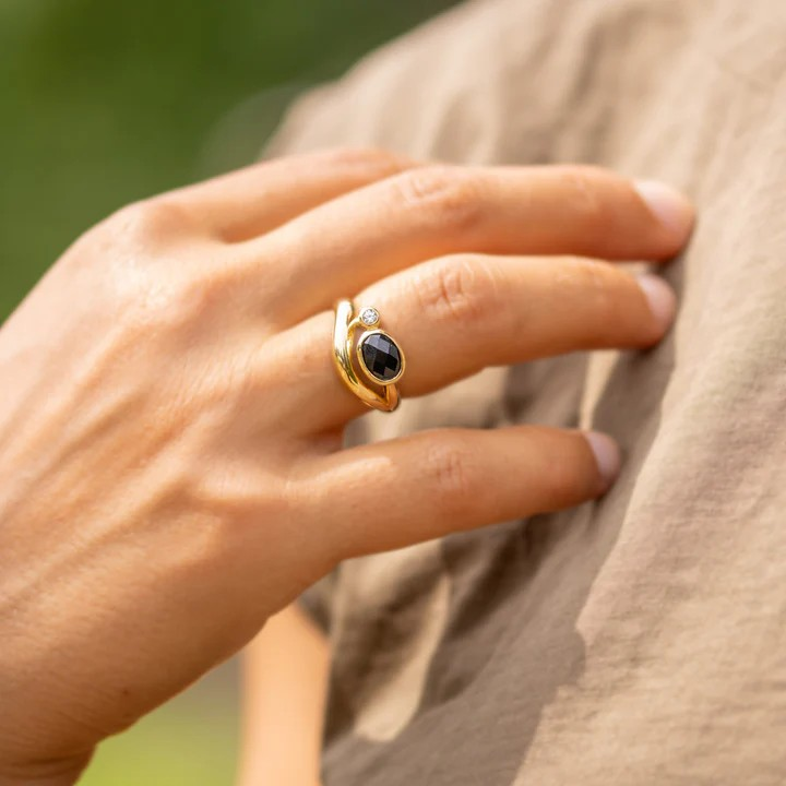 Deze vergulde ring is versierd met een 8 x 6 mm zwarte spinel en een 2,5 mm zirkonia.