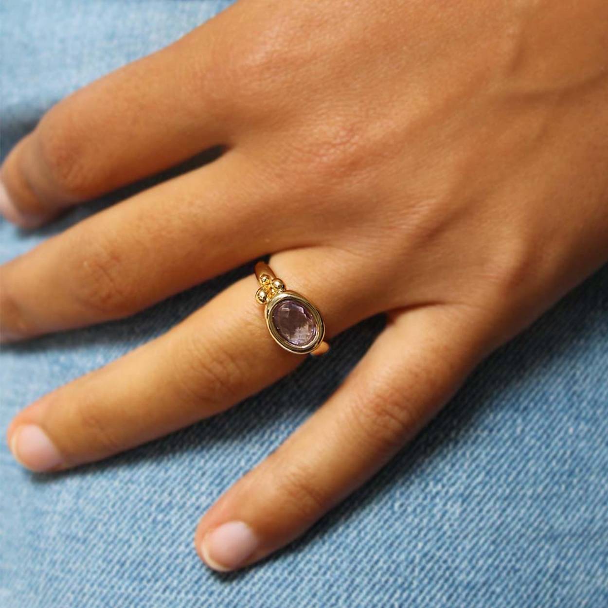 Deze geel goud vergulde ring bevat een 8 x 6 mm amethist.