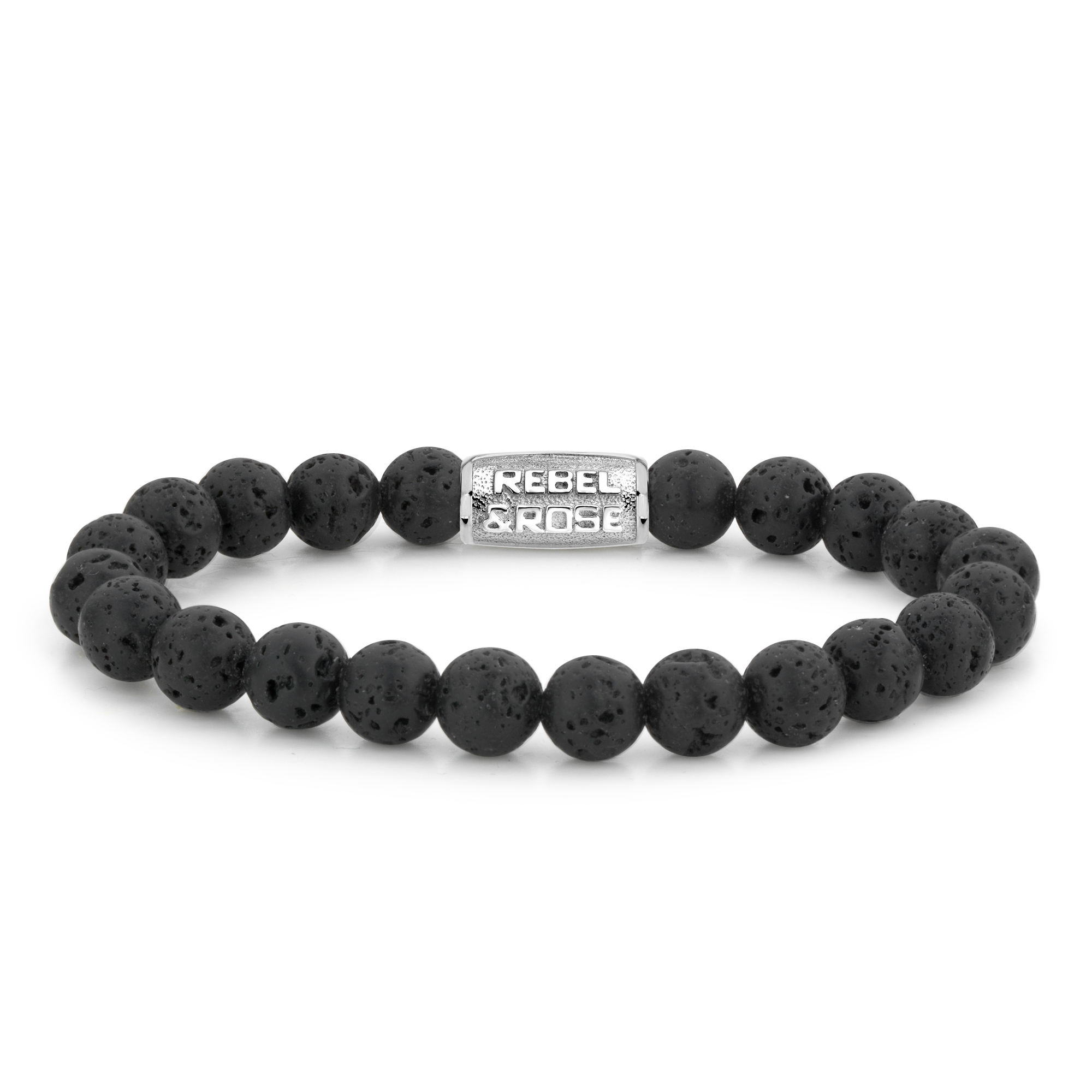 Bead armband, handgemaakt van 8mm zwarte Lava stenen met een zilverkleurige sluiting. Het Rebel & Rose sieraad is makkelijk te combineren met andere zilveren, leren of kralenarmbanden.