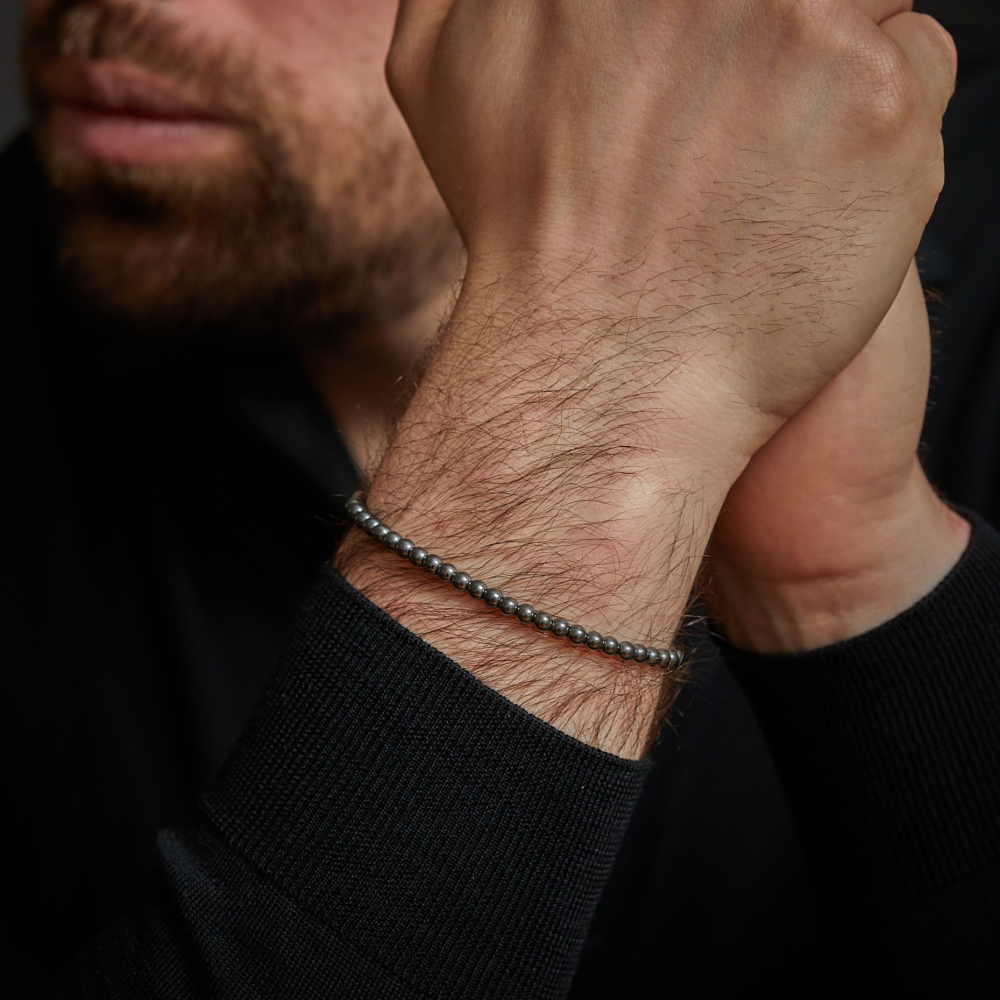 Bead armband, handgemaakt van 4mm grijze Hematiet stenen met een zilverkleurige edelstalen sluiting.