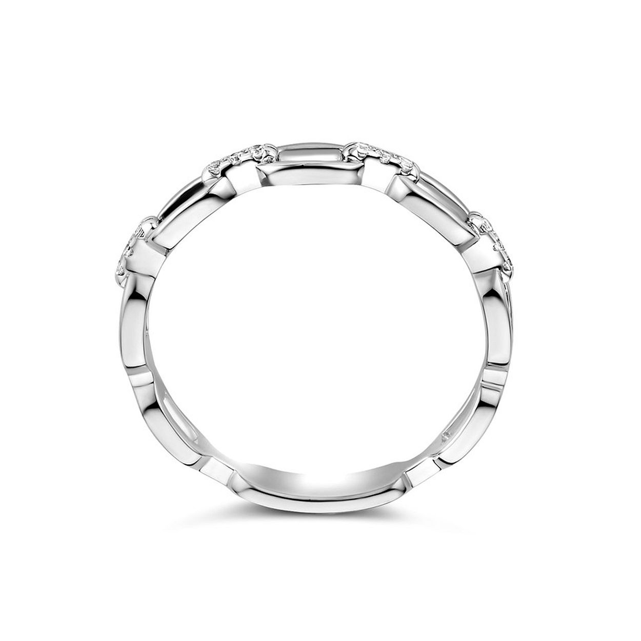 Gerhodineerd 925 zilveren ring uitgevoerd in schakelmotief en met helder zirkonia. De ring heeft een breedte van 3.2mm.