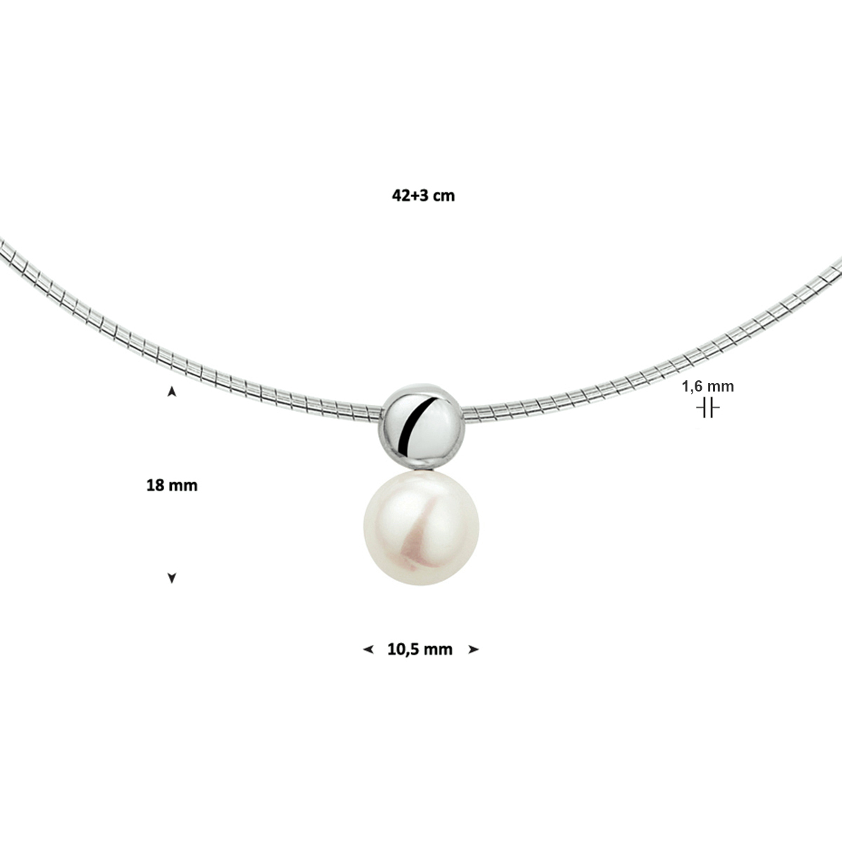 Beschrijving: Klassiek zilver gerhodineerd omega collier met een poli uitgevoerde zoetwaterparel hanger van 18x10.5mm. Het collier heeft een lengte van 42cm met een extensie van 3cm. De parel heeft een afmeting van 10.5mm. Tip: Combineer dit collier met een van de parel sieraden uit onze collectie en maak een schitterende set.