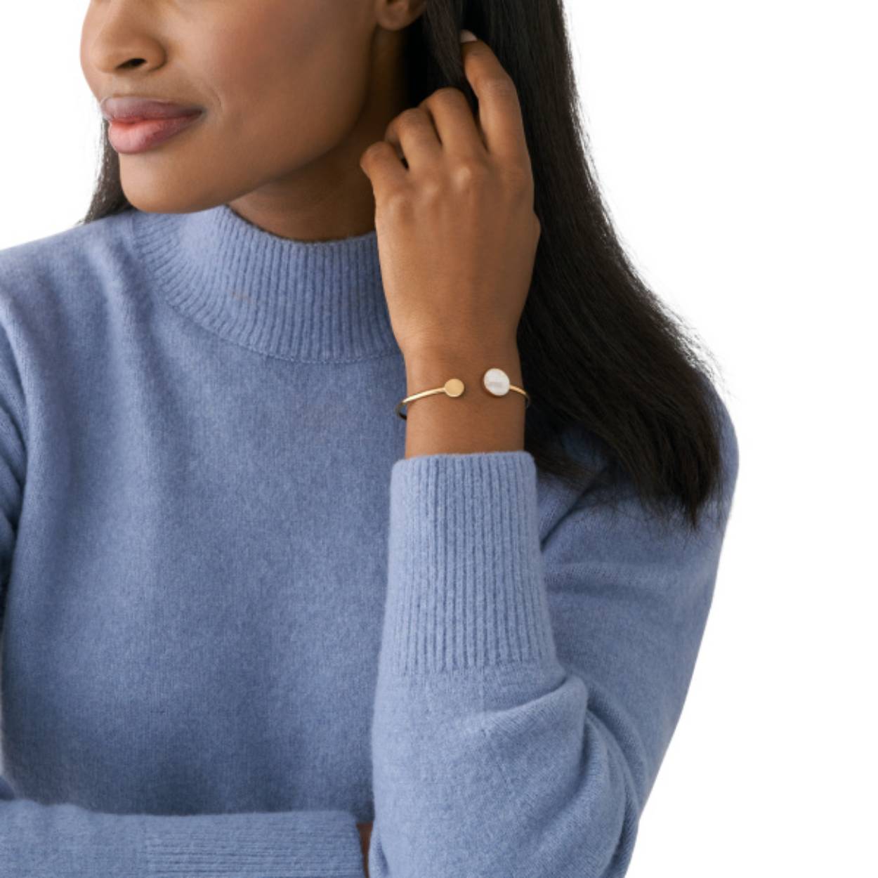 Deze manchetarmband is gemaakt van goudkleurig roestvrij staal en geaccentueerd met parelmoer.
