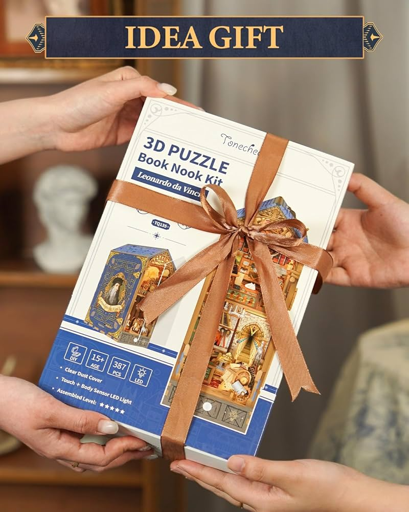 Tussen twee vergeelde boeken over renaissancekunst verschuilt zich een smalle doorgang. Zodra het licht aangaat, komt een verborgen atelier tot leven. Op het werkblad liggen halfgeschreven manuscripten, een miniatuurvliegmachine bungelt zachtjes aan het plafond, en uit een geheime lade steekt een vergeelde schets van een onbekende uitvinding.