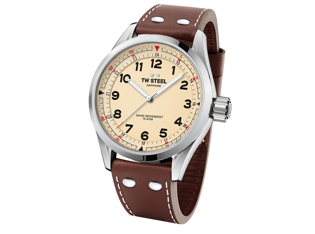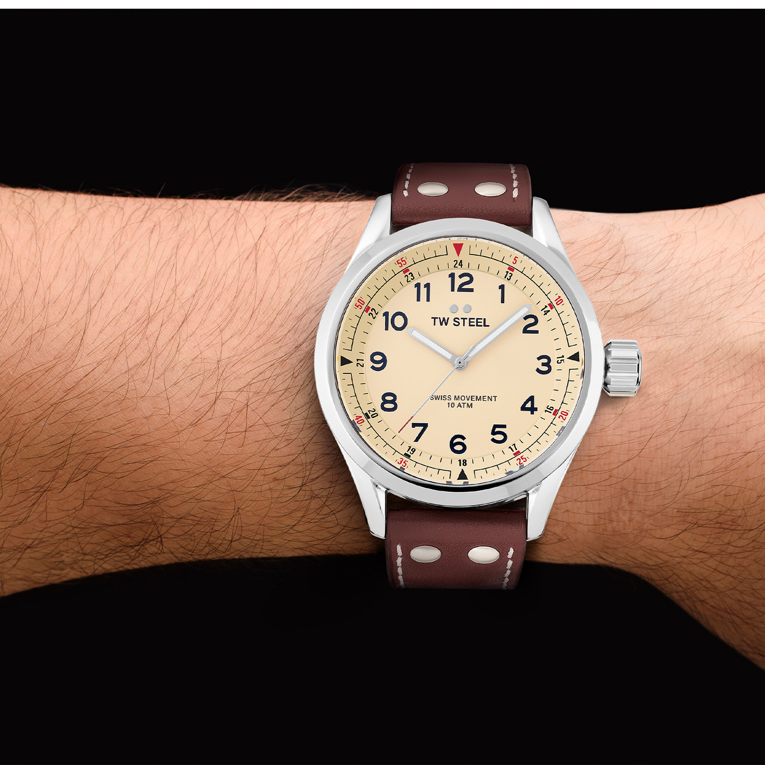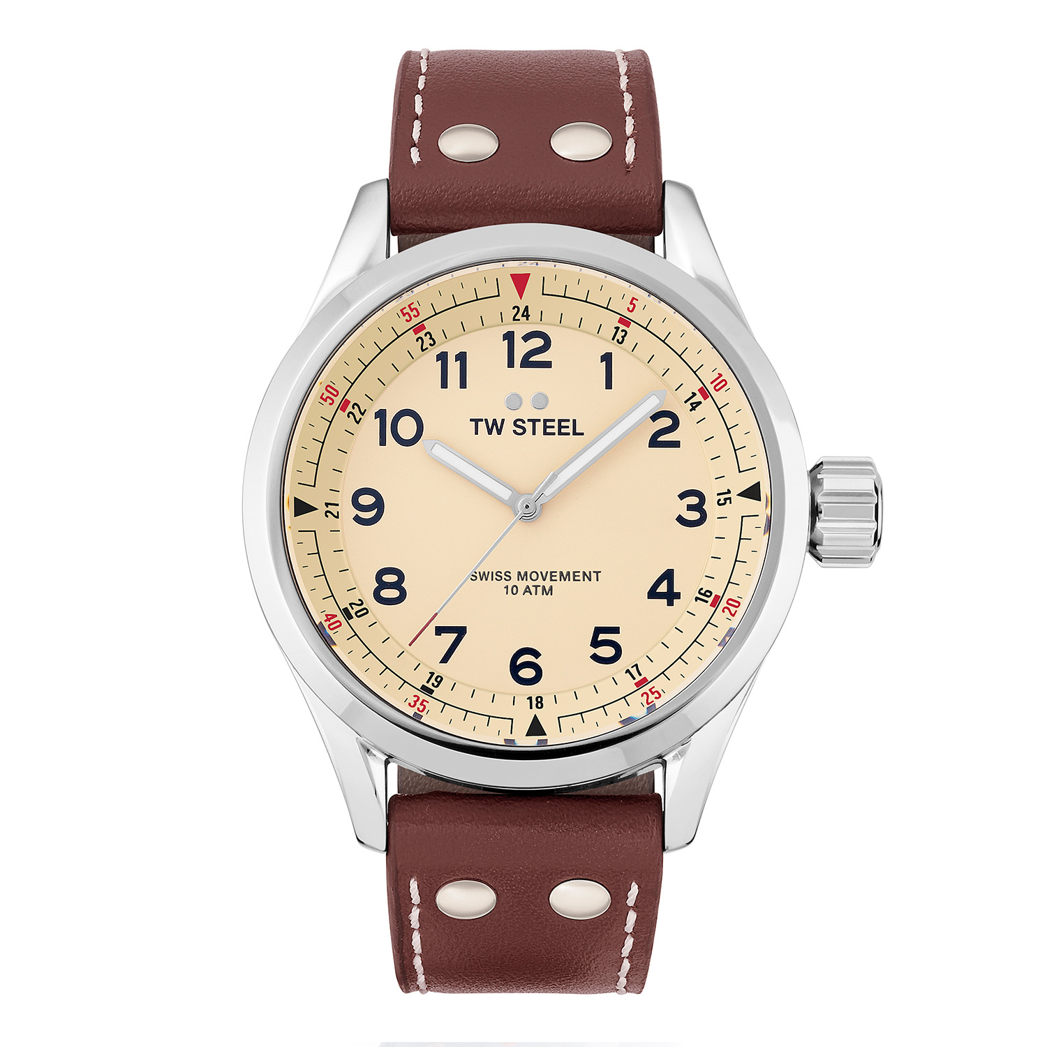 Deze Swiss Volante is voorzien van een glanzende 45mm stalen kast met saffierglas en een crèmewitte wijzerplaat. De SVS101 onderscheidt zich verder door het Swiss made uurwerk en de kalfslederen Italiaanse band.