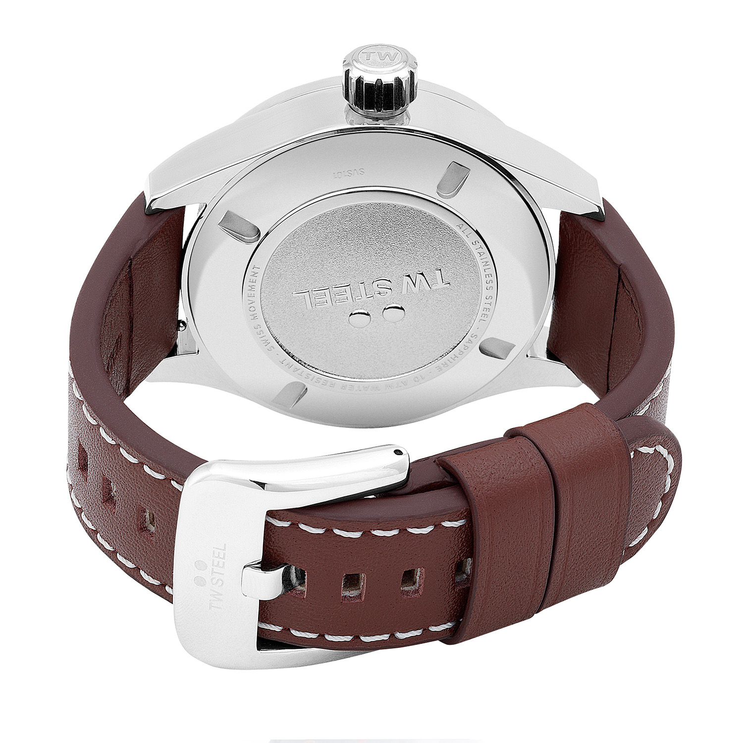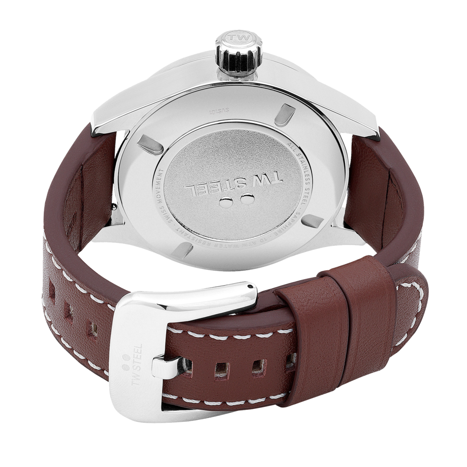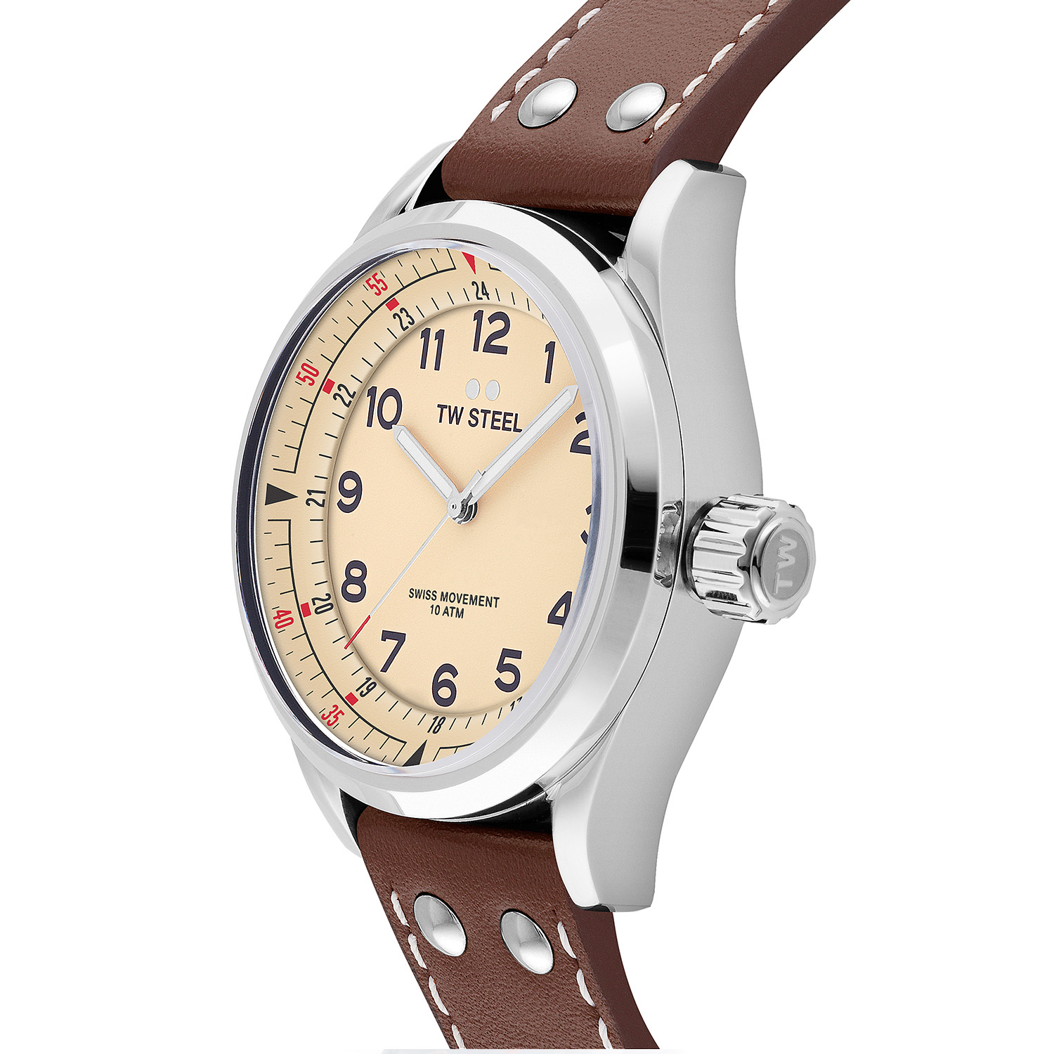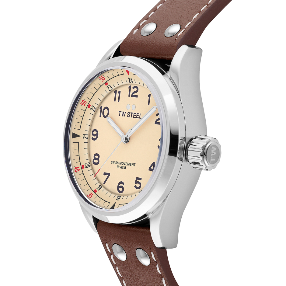 Deze Swiss Volante is voorzien van een glanzende 45mm stalen kast met saffierglas en een crèmewitte wijzerplaat. De SVS101 onderscheidt zich verder door het Swiss made uurwerk en de kalfslederen Italiaanse band.