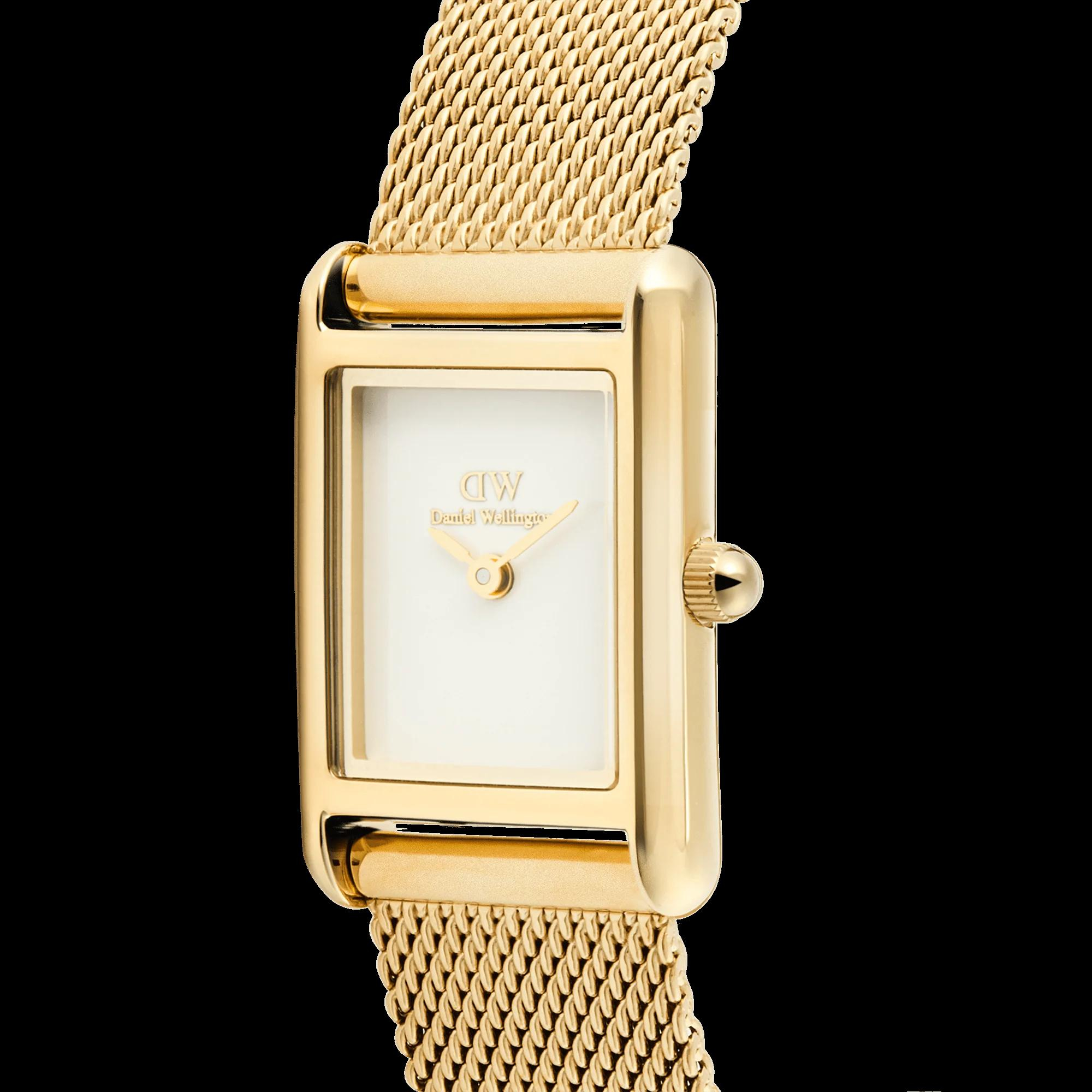 De Daniel Wellington Horloge BOUND MINI 17X26 EVERGOLD WHITE G (modelnummer DW00100928) straalt verfijning uit met een rechthoekige, goudkleurige behuizing en wit analoog quartz uurwerk. De 13 mm Milanees roestvrijstalen gouden band voegt elegantie toe. Draag deze polshorloge met formele of casual outfits voor een tijdloze look. Waterbestendig tot 3 ATM en nikkelvrij.