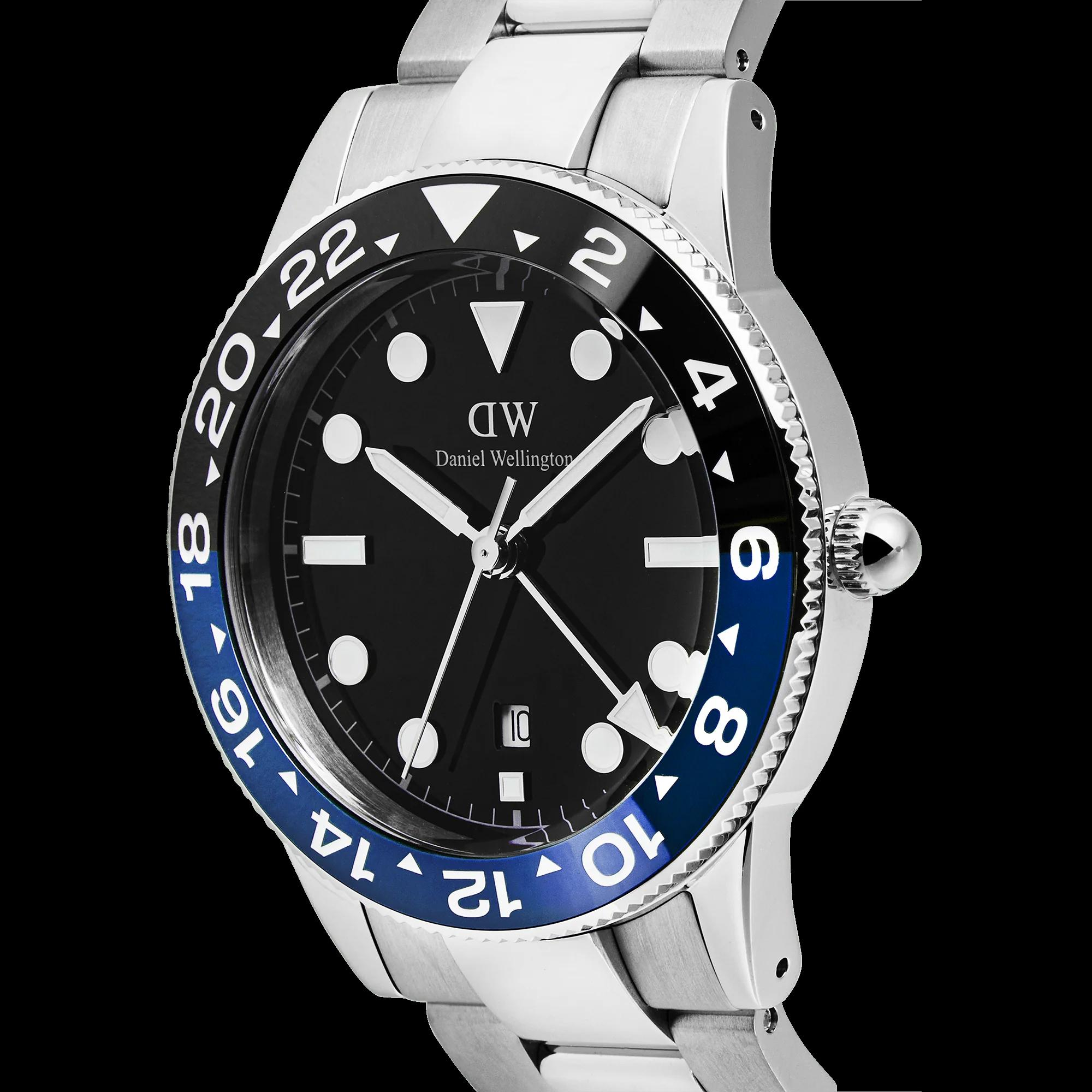De Daniel Wellington Horloge ICONIC GMT 40 LINK BLACK BLUE CERAMIC BEZEL (modelnummer: DW00100921) heeft een zwarte wijzerplaat en zwarte kast, beide van roestvrij staal. Het is waterdicht tot 10 ATM en heeft een zilverkleurige roestvrijstalen band van 21 mm. Met quartz uurwerk en datumfunctie. Draag casual of formeel als stijlvol statement op je pols.