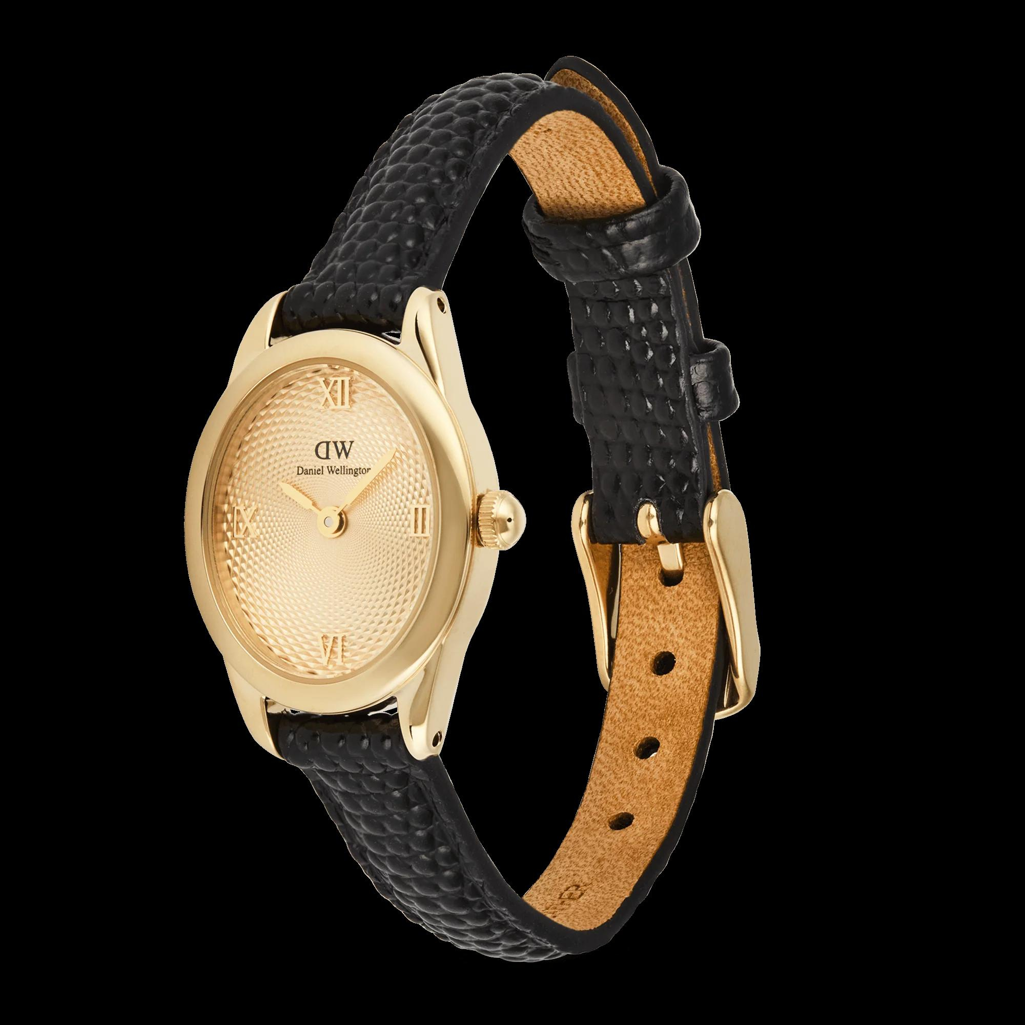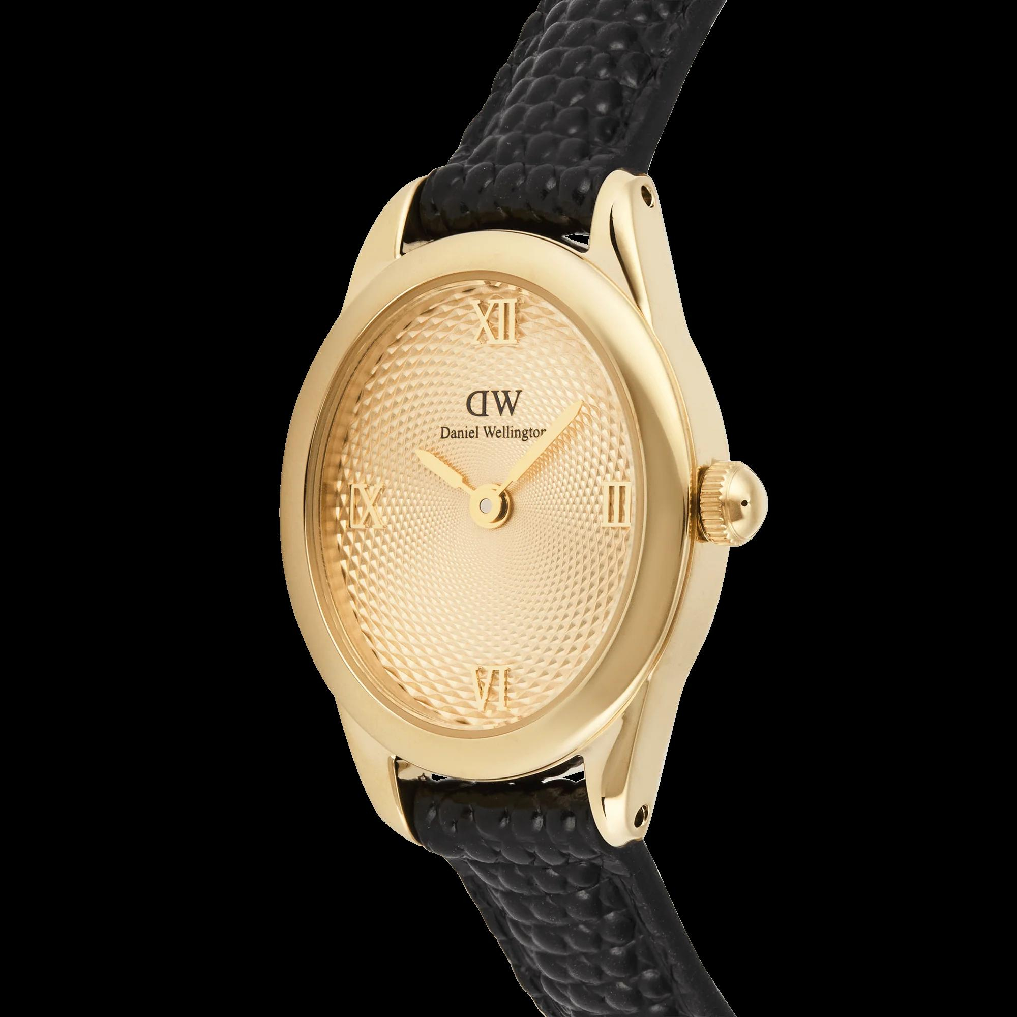 De Daniel Wellington Horloge OPHELIA MINI (modelnummer DW00100897) heeft een gouden ovalen wijzerplaat met Romeinse cijfers, analoge wijzers, en een zwarte leren band. Het is voorzien van quartz uurwerk, is tot niveau 3 waterdicht en is nikkelvrij. Ideaal voor een elegante en verfijnde stijl, perfect te dragen bij formele en casual outfits.