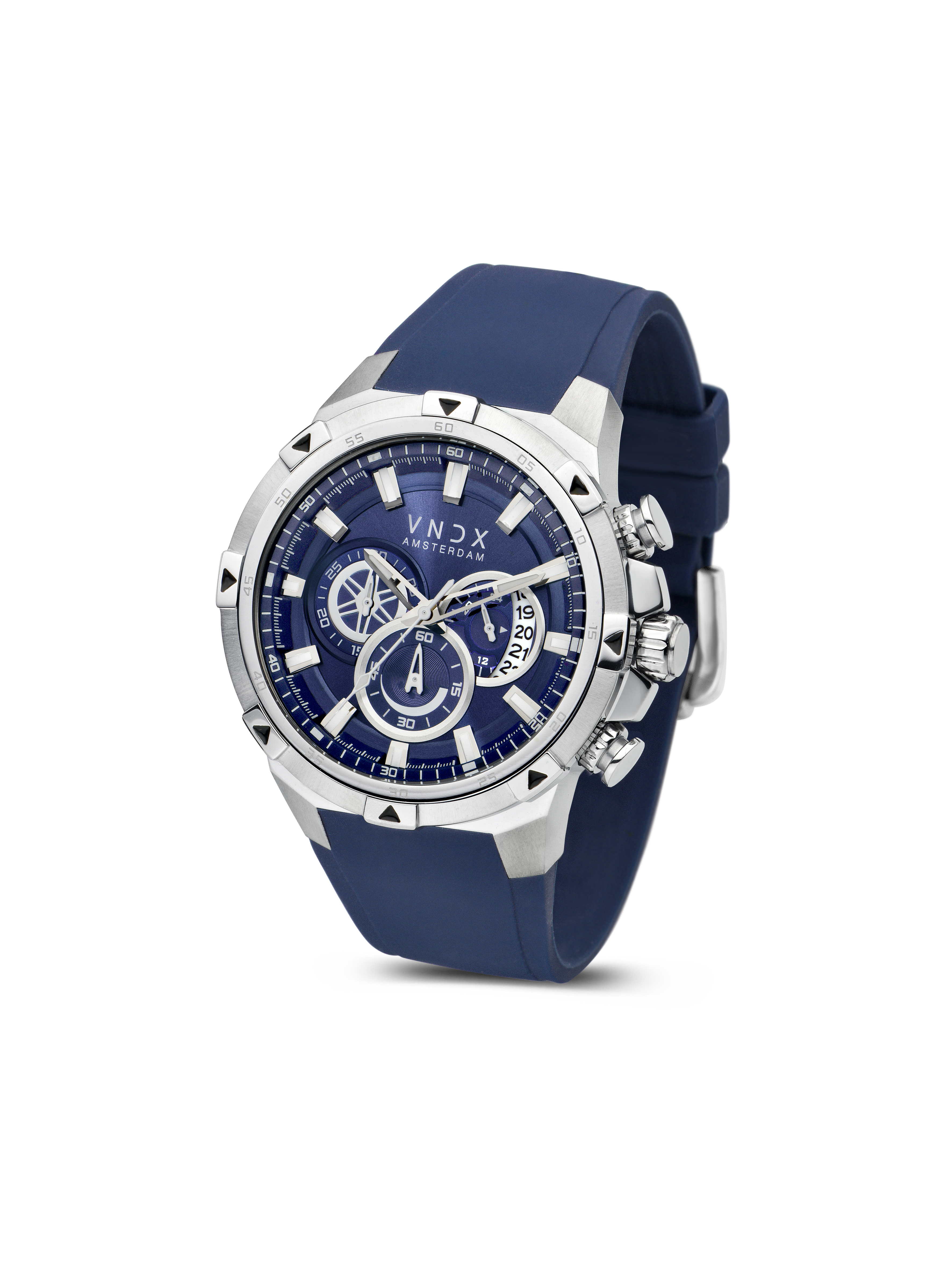 Deze chronograaf is voorzien van verschillende functies, zoals een stopwatch, datum aanduiding en een 24-uurs klok. De veelzijdige chronograaf wordt gepresenteerd op een intens blauwe wijzerplaat.