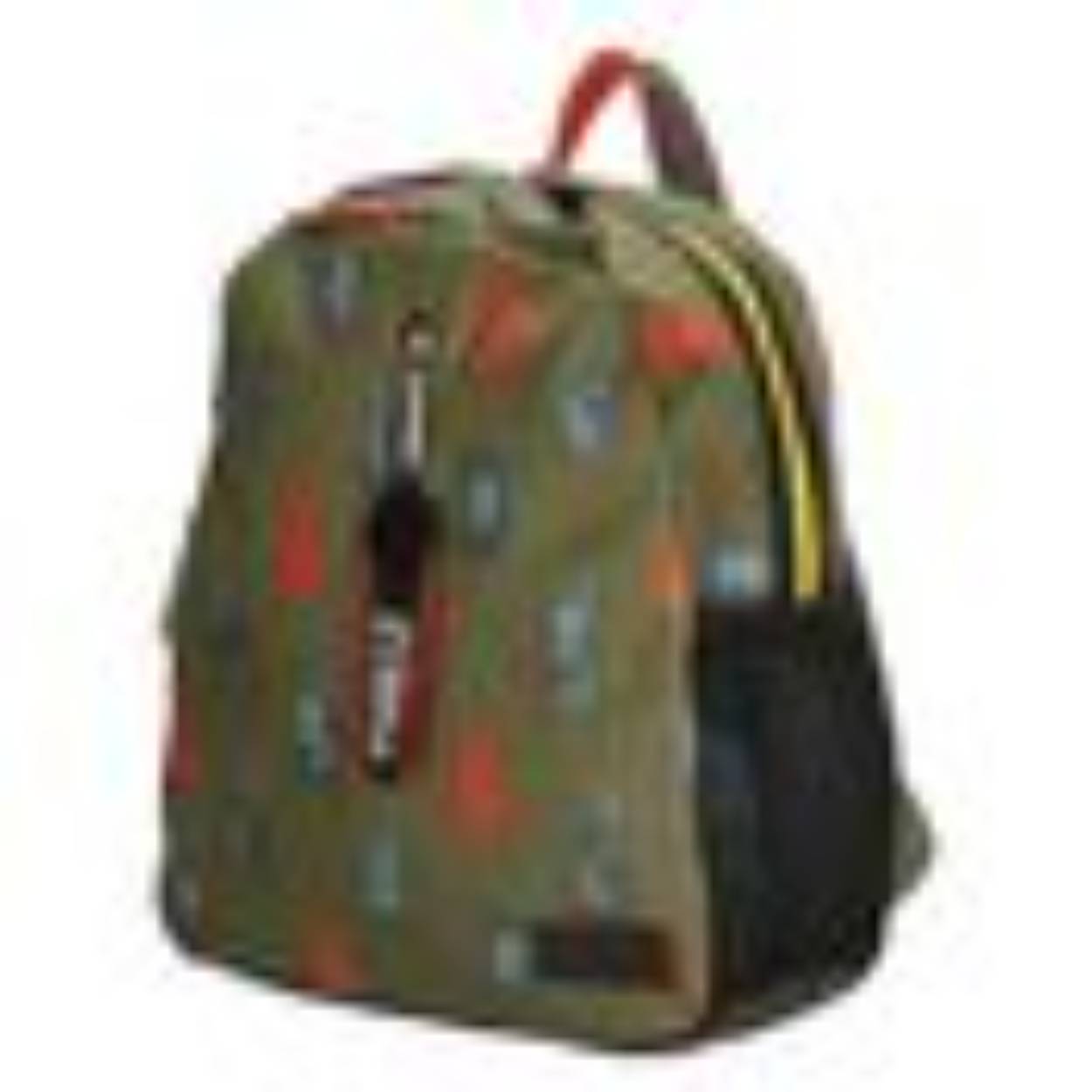 Een tas vol beetles! Stoere legergroene canvas tas met gekleurde accenten. De rugzak sluit met een fel gekleurde blokrits met dubbele sluiting en voorop zit een verticale rits met daarachter een extra opberg vak. Aan de bovenkant van de rugtas is een handvat met een vrolijke binnen kleur.