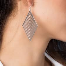 Zilverkleurige oorbellen voorzien van haakjes met een lange hanger in de vorm van een ruit. Blijft lang mooi, irriteert niet en geeft niet af.